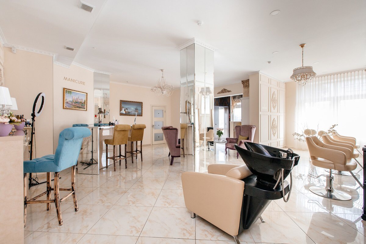Салон просторный, с итальянским оборудованием и очень дорогим интерьером.  Высокие потолки и большое количество дневного и искусственного света, вентиляция, WI-FI, спутниковое TV, аудио-оснащение. Помещение 90 кв. м.(выгодная и долгосрочная аренда с правом первоочередного продления)