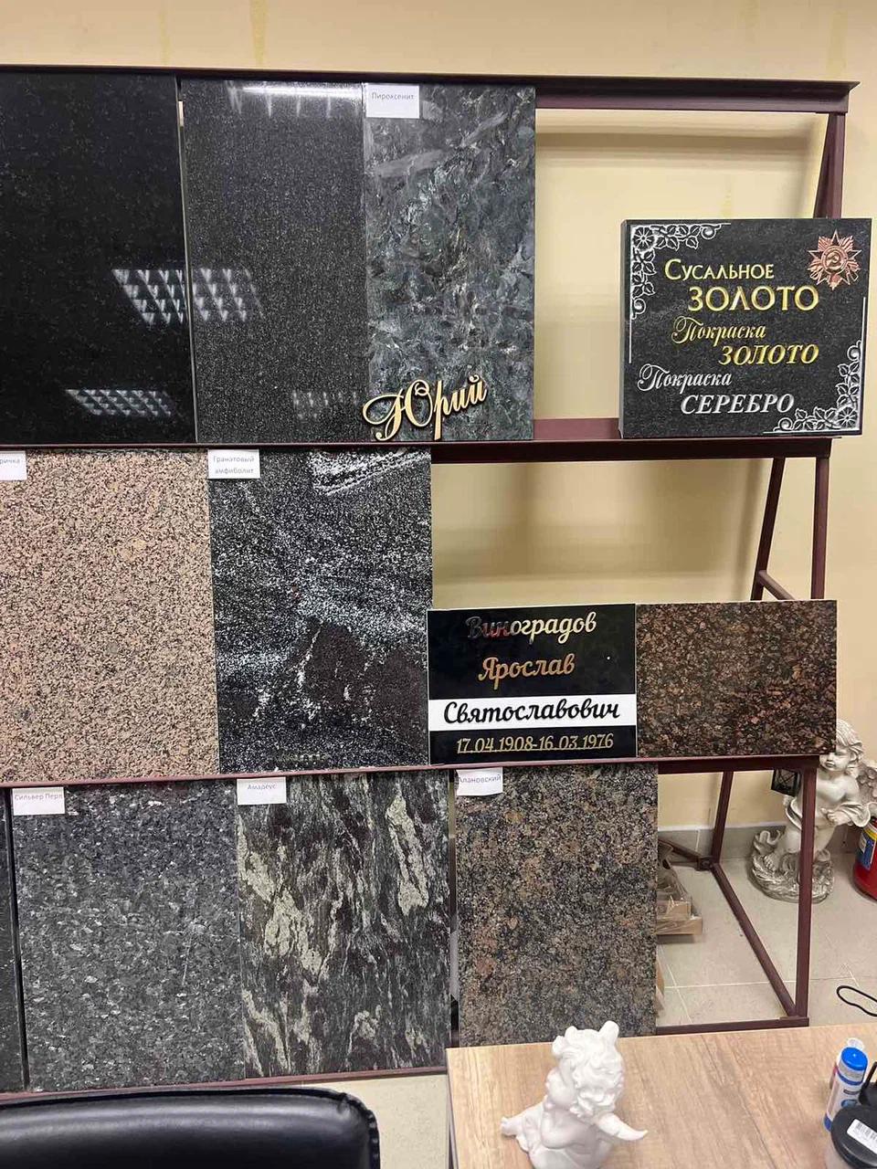 Продукция: Полный цикл работ от изготовления до установки. Памятники из гранита и мрамора (вертикальные, горизонтальные, парные, одиночные), ограды, скульптуры, барельефы, комплексы, а также сопутствующие товары (венки, корзины). Отдельное помещение выделено под продажу ритуальных принадлежностей.