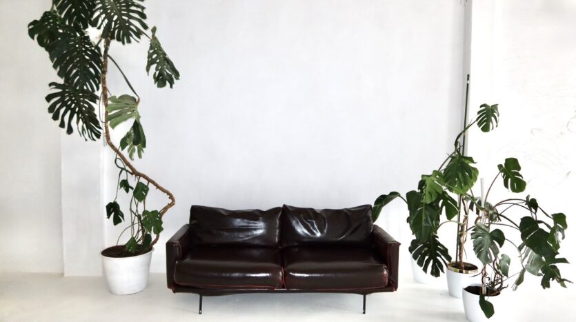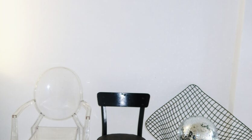 Меблировка: диван в стильной обивке цвета «Бургунди» со сменными чехлами, разнообразные стулья и кресла, зона ресепшн, стеллаж, гримерный стол с зеркалом, рейлинги для одежды.