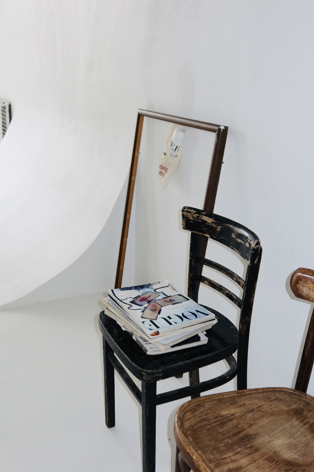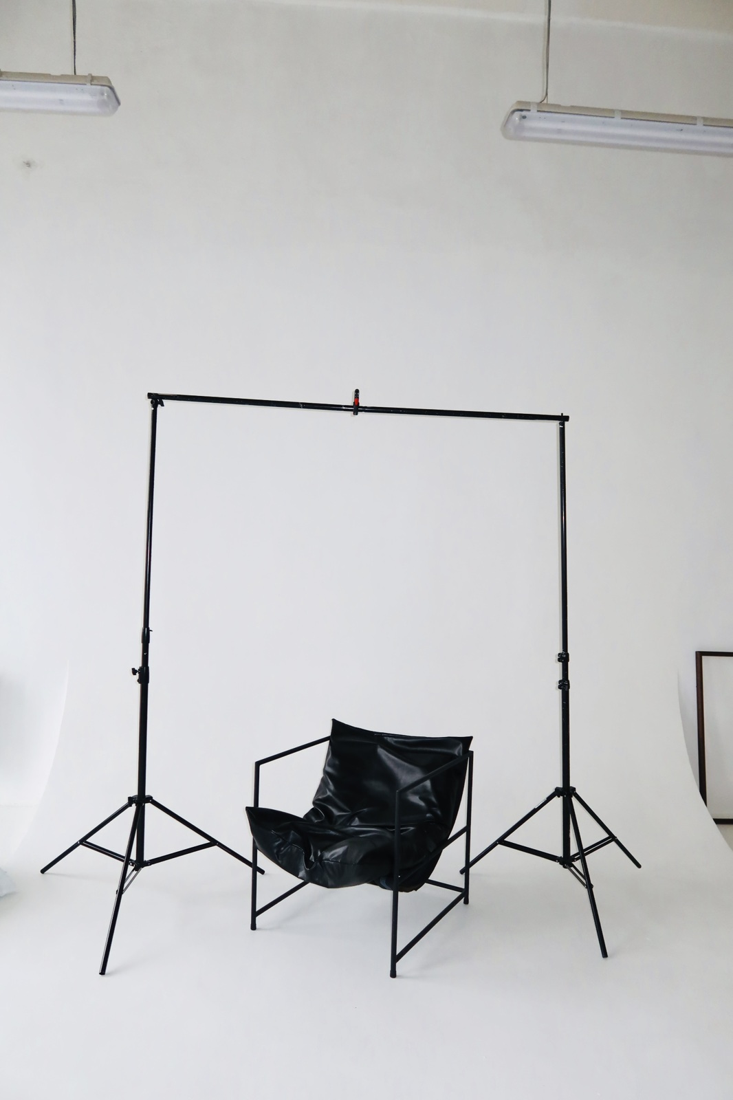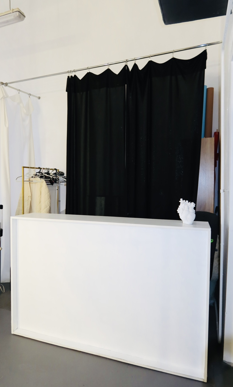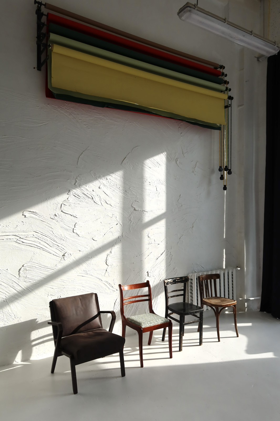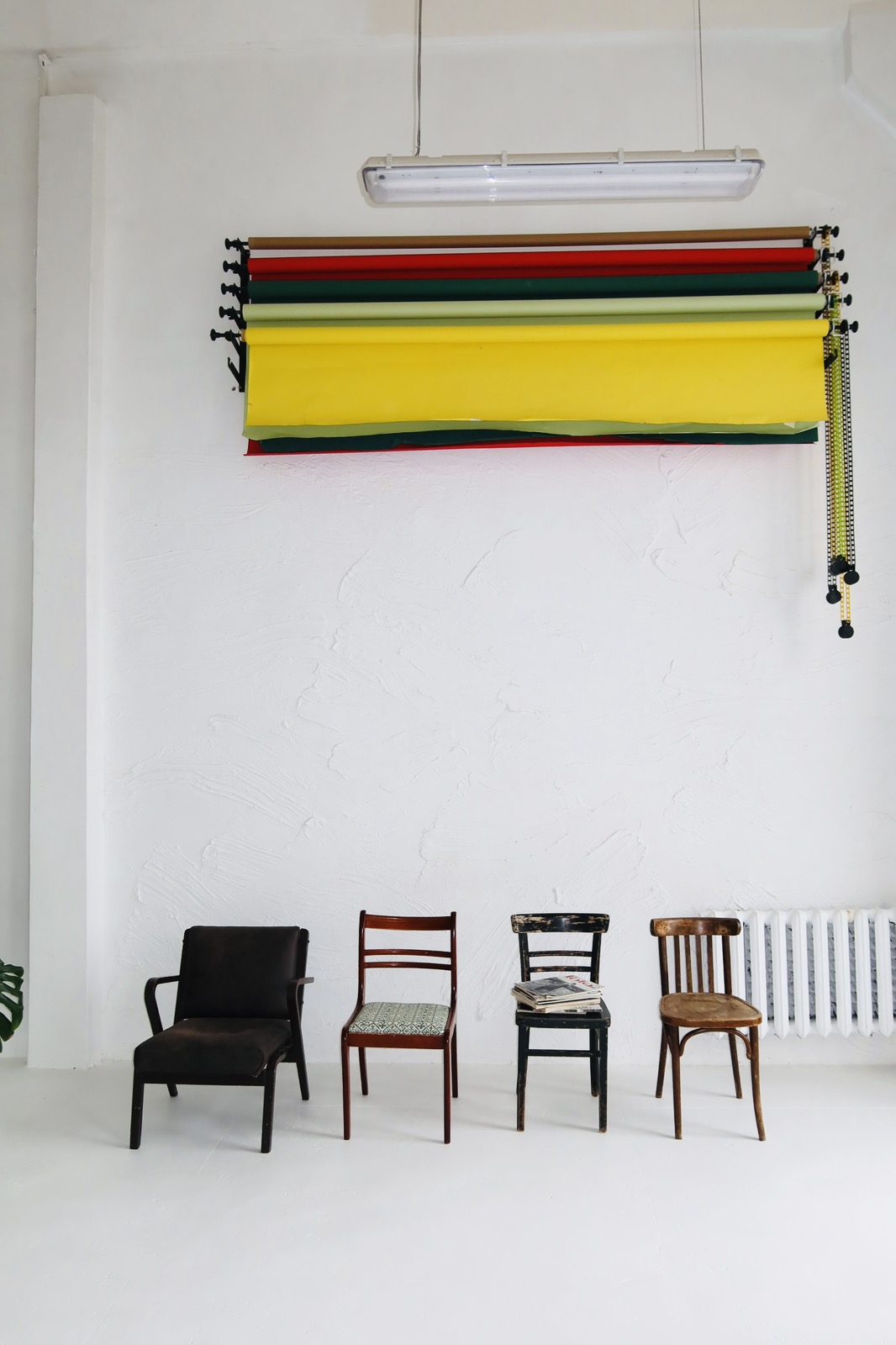 Настенная система крепления на 6 фонов, 5 бумажных и несколько тканевых фонов со стойками.