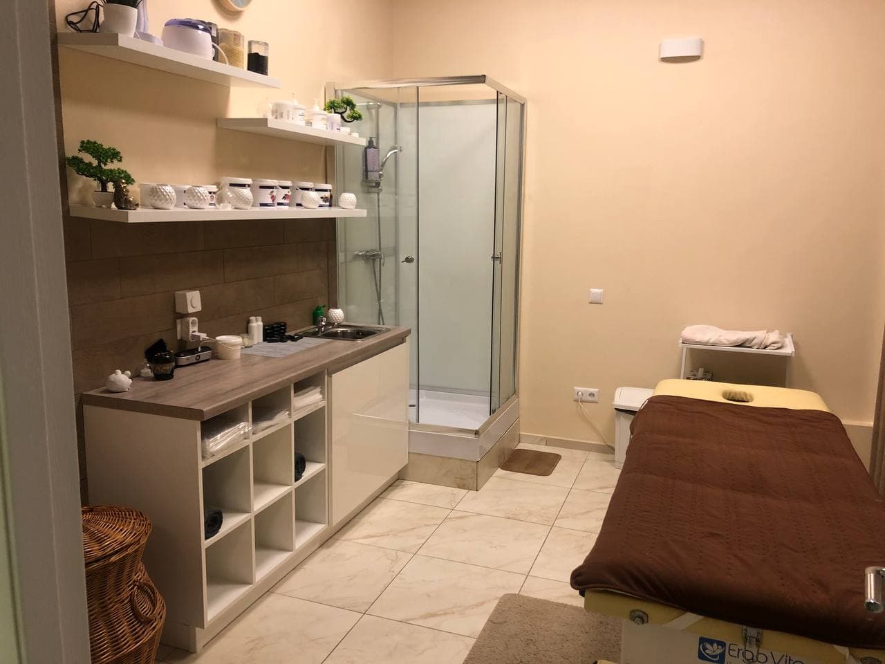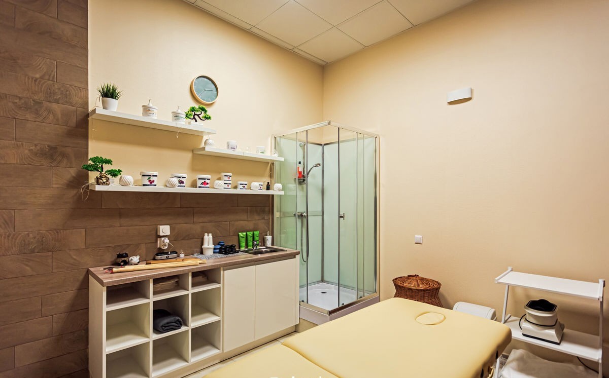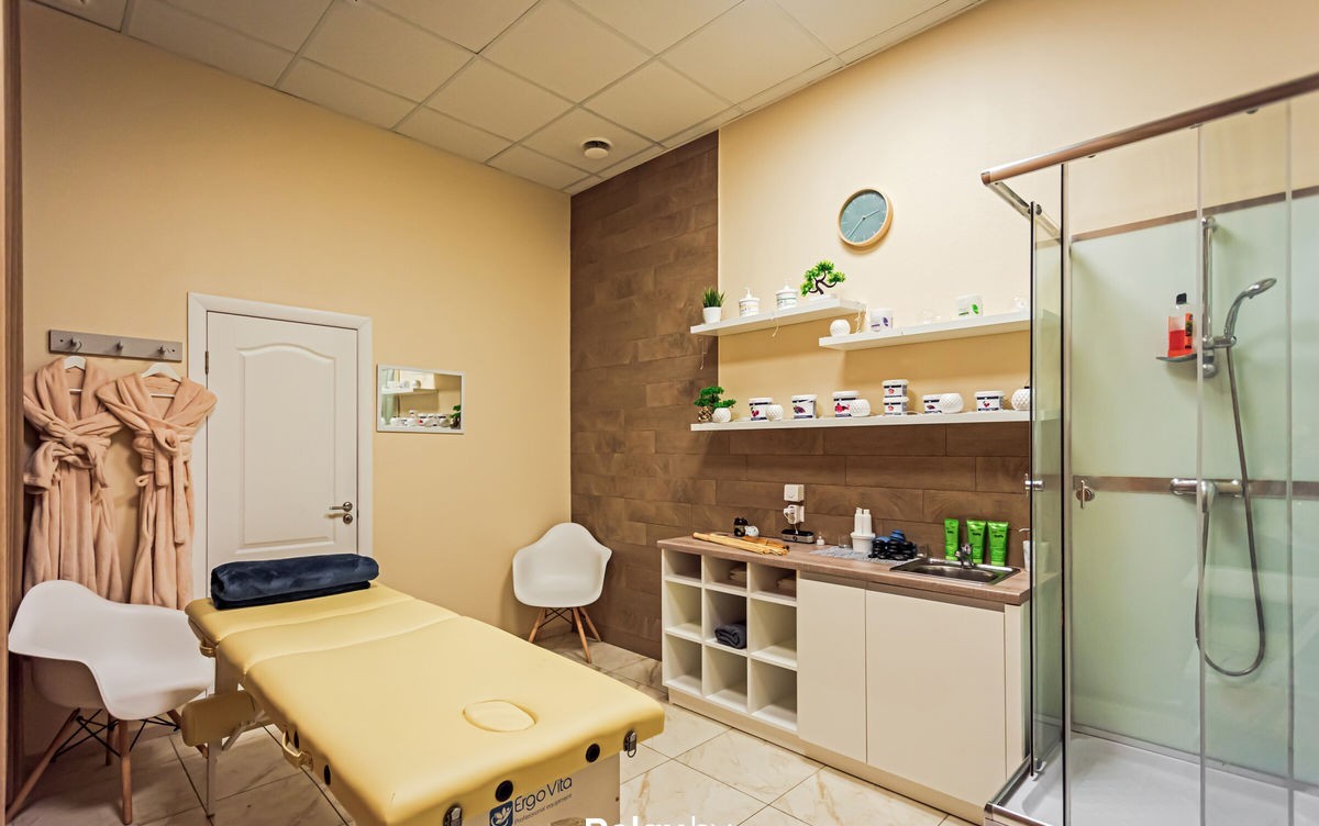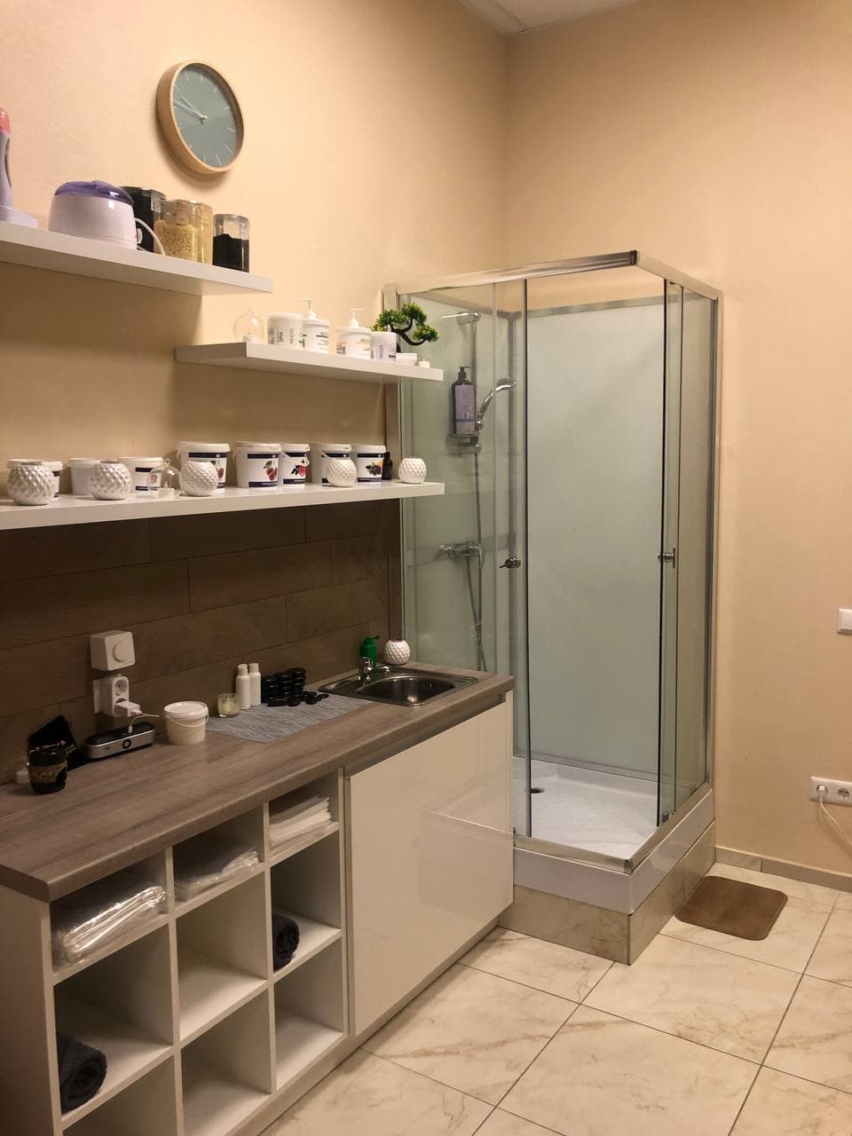 Есть 2 взаимозаменяемые рабочие зоны с раздельными входами: 1- комната массажа и спа-услуг (имеется душевая кабина, оборудованная зона с вытяжкой для кедровой бочки); 2- комната косметолога, где выполняются уходы за лицом и депиляция. Зоны спроектированы таким образом, что можно выполнять парные спа-программы, массажи.