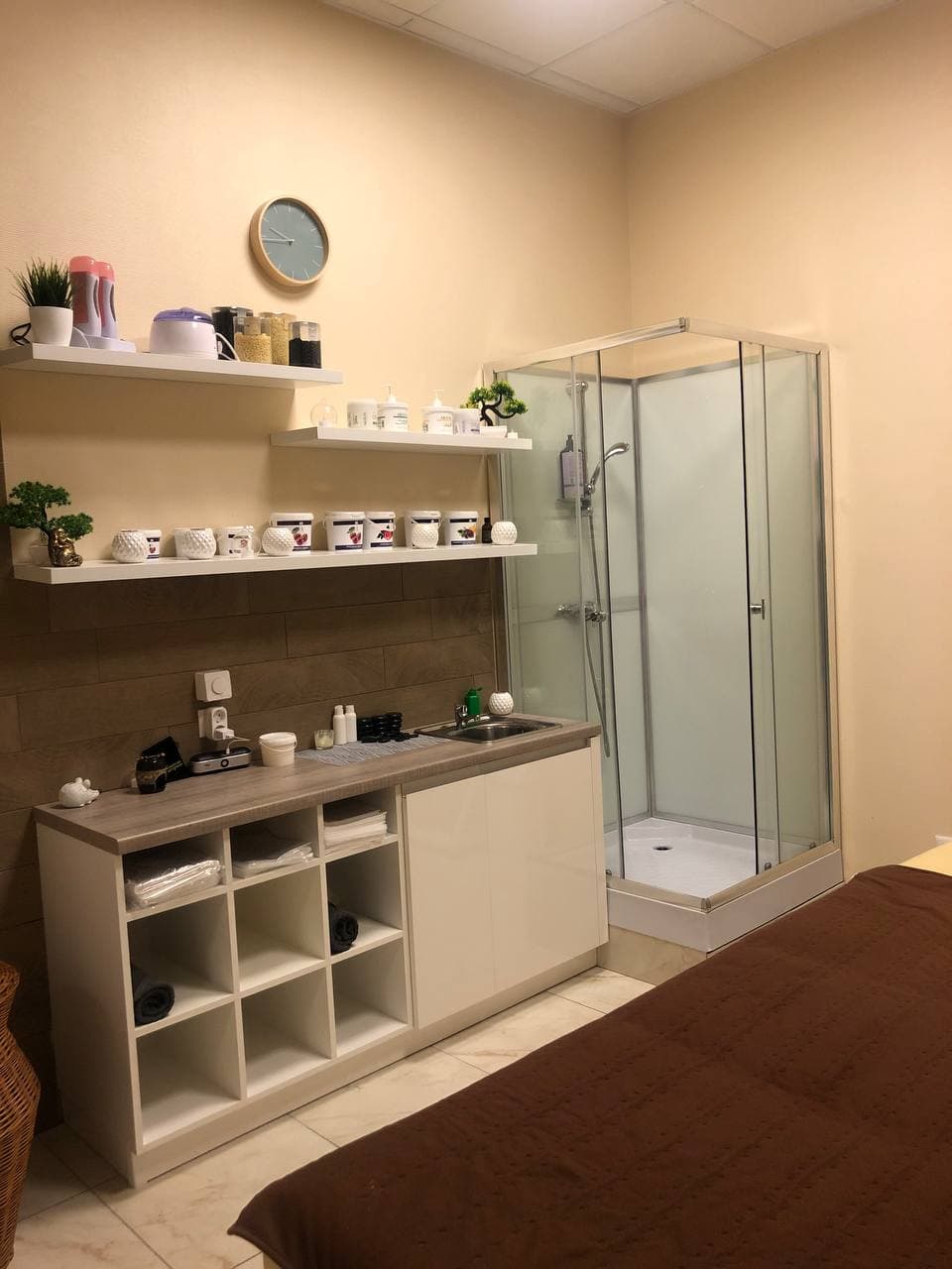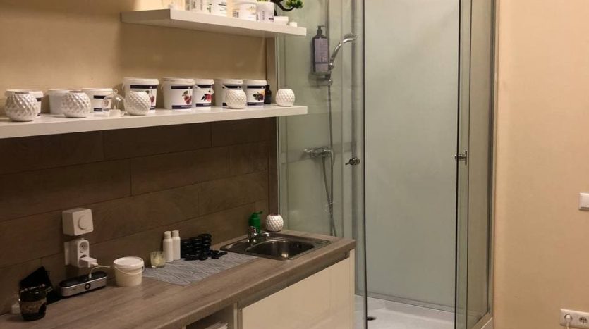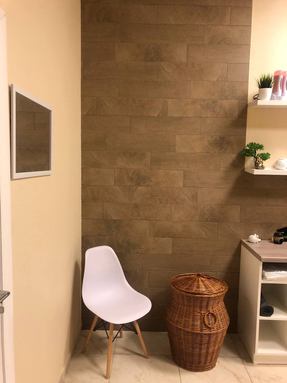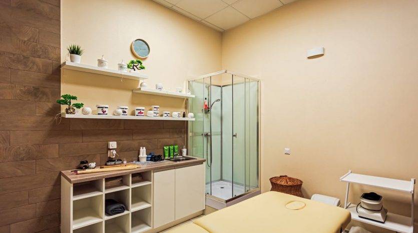 Есть 2 взаимозаменяемые рабочие зоны с раздельными входами: 1- комната массажа и спа-услуг (имеется душевая кабина, оборудованная зона с вытяжкой для кедровой бочки); 2- комната косметолога, где выполняются уходы за лицом и депиляция. Зоны спроектированы таким образом, что можно выполнять парные спа-программы, массажи.