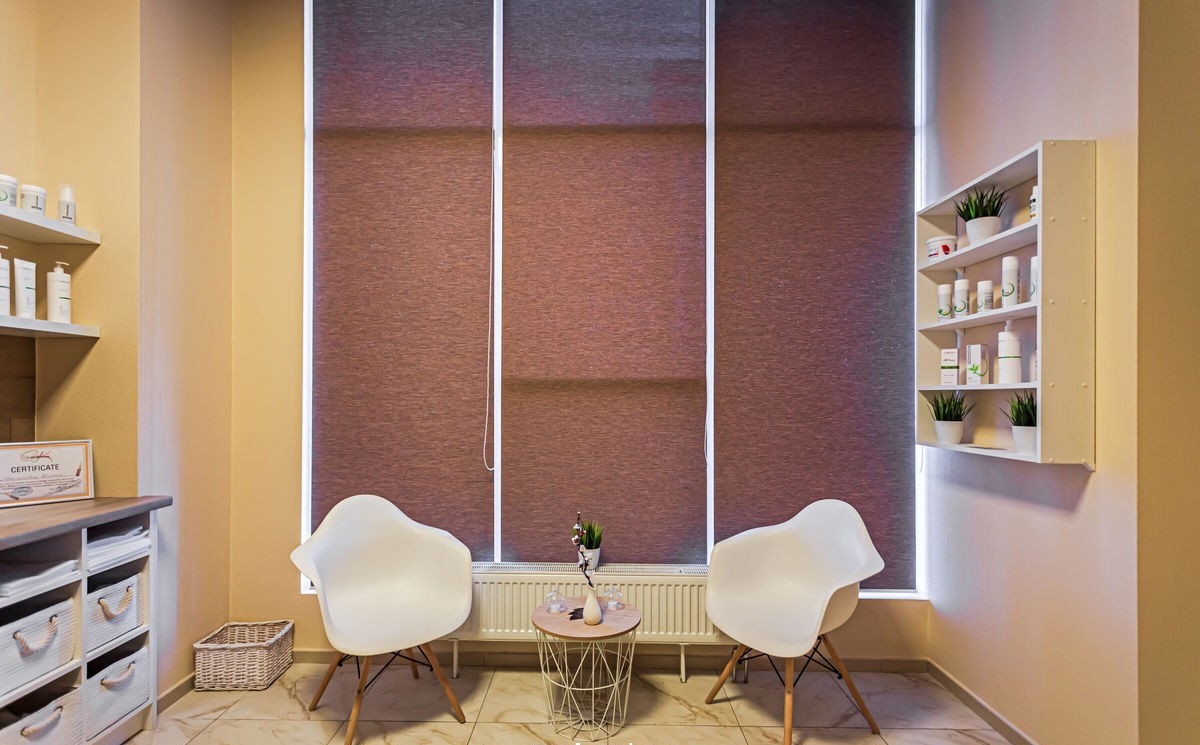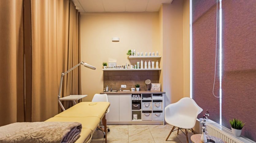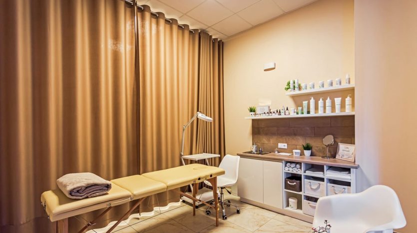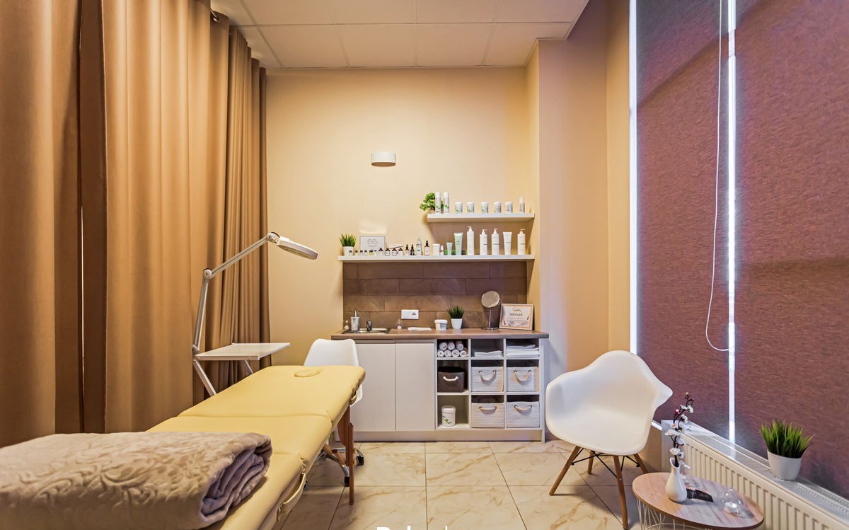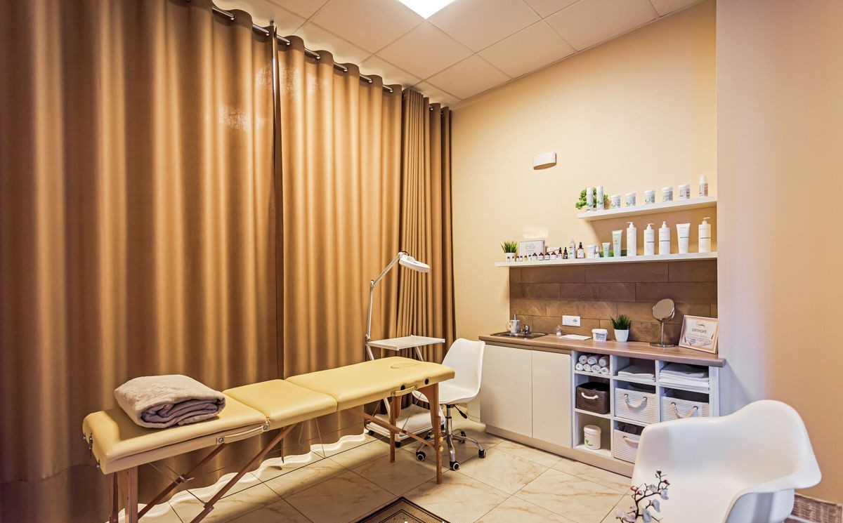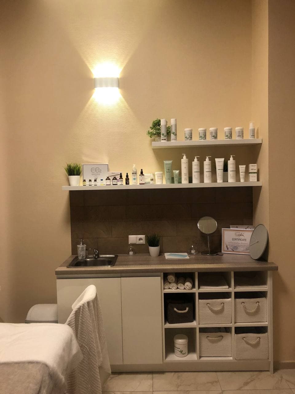 Каждая комната оборудована мини-лабораторией из моющихся материалов с подведенной водой (изготавливались под заказ), подвесными полками, профессиональными кушетками Ergovita со всеми аксессуарами, косметологическими стульями и тележками, лампой-лупой, зонами для чаепития гостей, элементами декора (доп. освещение, цветы, подсветка и мн. др.), ящики-органайзеры, на стенах располагаются часы, зеркала, вешалки.